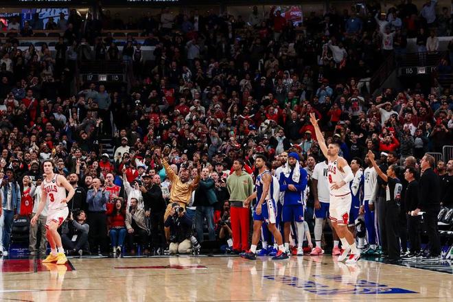 首节还剩下4分多钟的时候,公牛队落后了11分。倒也不是他们打得很差,而是76人进攻端状态有些太好了。7分半钟的时间,公牛队得到了20分,不算很差。而76人则砍下了31分,首节打完,他们得到了45分,确实是夸张。而且,出色的进攻效率还延续到了次节,76人官方甚至都在社交媒体上发文:“没忍住笑出声了,不敢想这竟然是我们现在的生活!”不过下半场,公牛队展现了他们东部第一的势头。在76人开局勇猛的情况下,第三节结束的时候,公牛队还是保持着11分的分差,没有让76人一波流带走。而且末节,公牛队成功限制76人接近半节时间不得分(76人自身手感也很差),而公牛队则是趁机疯狂追分。